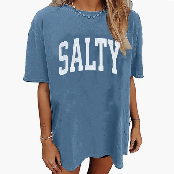 Oversized graphic tee with "Salty" message. On a blue heather shirt.