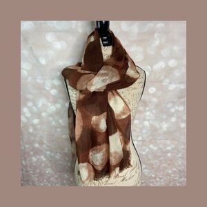 Lovely light and soft scarf in brown tones and fringed ends. No label or material content. Excellent condition