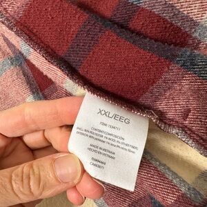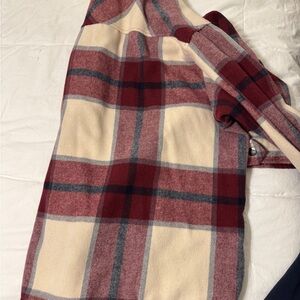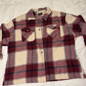 Stylish red and cream plaid button-up Shacket. Features a classic design with front pockets. Wide and boxy with thick durable fleece/wool feel.