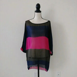 Allegra K Color Block Sheer Hi Low Sheer Oversized Tunic, Thick Stripes in colors of Olive Green, Navy Blue and Bright Pink. Perfect to wear dresses up or down or even for a swimsuit cover up at the beach or pool. Fantastic Condition. Size Small. Smoke Free Home, Fast Shipping.