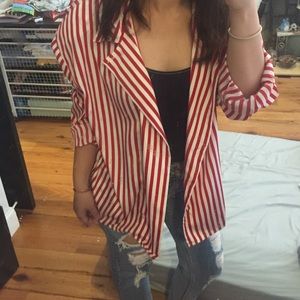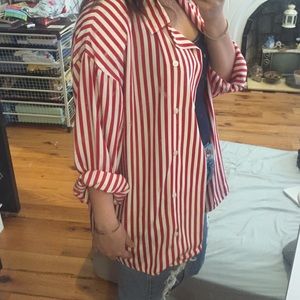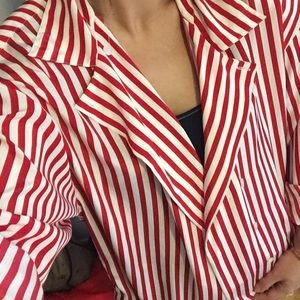 Oversized shirt made from silk with a classic vintage red and white stripes. Can fit from a XS to L as an oversized shirt. Light weight and cooling.