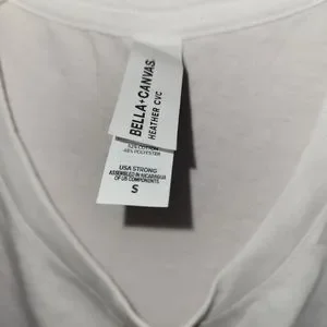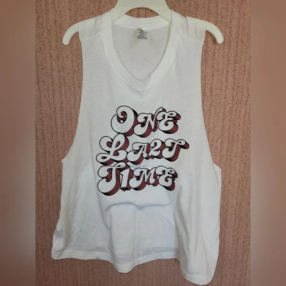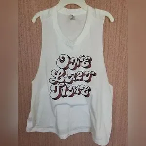 Wide arms, wide crew neck, stark white tank top with "one last time" graphic design. Size Small. NWOT!