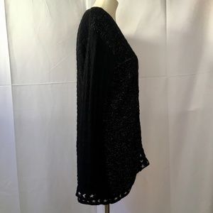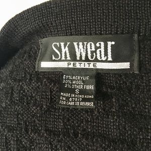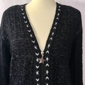 Women's SK Wear oversized black & silver tone star & moon print zip up statement cardigan sweater jacket size small petite. Wool blend. Long sleeve V-neck relaxed fit. Shoulder pads, can cut out if that's not your thing. Basic staple everyday essential versatile neutrals. Comfortable comfy cozy. Transition layering piece. Casual street style streetwear. Spring fall winter fashion. Great for Halloween / witch's costume. Approx.: 40" bust; 30" long. Excellent used condition. 10% off bundles!
