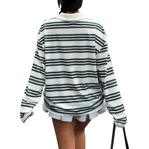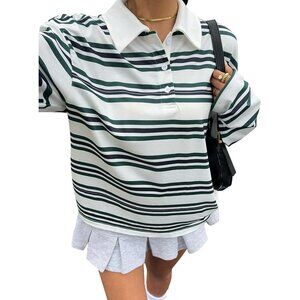 This Oversized Striped Long Sleeve Polo Shirt is the perfect preppy, laid-back top to add to your wardrobe. Soft and stretchy with 95% cotton and 5% elastane, it feels super comfy and has a relaxed, loose fit. The green and white stripes add a classic, yet fun touch, making it versatile for casual days, fall outfits, or even a relaxed teacher vibe. The V-neck and half-button front give it a cute, sporty look that works great layered or on its own.