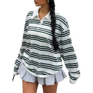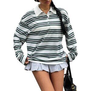 Oversized Striped Long Sleeve Polo Shirt Women V Neck Preppy Top