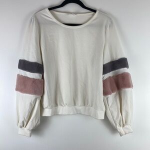 Oversized Sweatshirt Faux Fur Sleeves White/Cream with Pink Purple Fur Size M