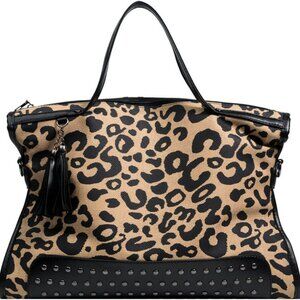 Features: This roomy tote measures about 16.9 x 12.6 x 5.5 inches — big enough for your laptop, books, or weekend essentials. The structured interior includes a large zipper compartment with zip and open pockets for organization. Crafted from vegan PU with a fun jacquard cheetah pattern and punk rivet accents, it adds edge to any outfit.