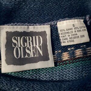 A 90s vintage Sigrid Olsen sweater-- very oversized! Probably could be worn as a dress, if you're not too tall. Featuring a folksy fair isle print in various shades of blue, purple, white and brown. Some more 3D embroidery on the front side, and a rolled mock neck. 55% Ramie and 45% cotton. Pretty good condition-- though mildly faded with a few little puckers throughout (like the ones show in the final pic). Labeled a Small, but it’s over-sized, and would also probably fit most Mediums.