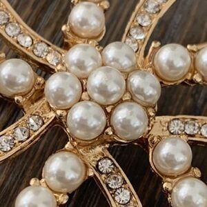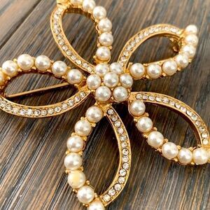 TAGS: pearl brooch, floral pin, rhinestone bow pin, vintage-style accessory, gold tone brooch, wedding brooch, formalwear accessory, heirloom-style pin, retro cocktail jewelry
