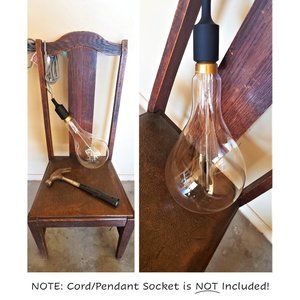 Crazy Cool HUGE Edison Bulb! What’s the deal with mega, oversized, grandiose vintage bulbs? Well, they are super on-trend. And, they are big, like a 12" length and 6" diameter big. This Edison-style reproduction bulb is clear glass with a visible filament that recalls the early 1900s, giving your home historic charm or a steam punk vibe. Oversized bulb is 60W and fits in a standard/medium E26/27 socket. This bulb can be screwed into a lamp base you already have, or suspened from a swag-style socket pendant (as shown in the photos). Easy peasy! Comes in original packaging. Super swanky!