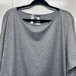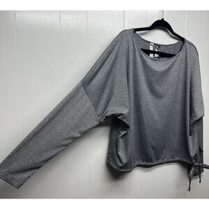 Womens pullover gray top. Scoop neck. Drop shoulders. Long dolman sleeves. Drawstring at the bottom hem. Cut out in back detail. Semi-cropped. Relaxed boxy fit. In good used condition. No stains, tears or holes.