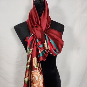 Oversized Womens Polyester, Silky Scarf Deep Red Floral With Border 72 x 36.