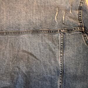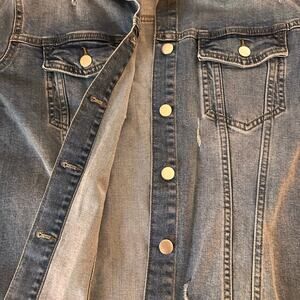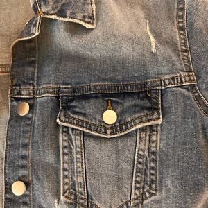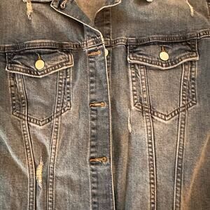 NWOT. Distressed women's denim trucker jacket, size Medium. Quality denim. Nice long length. Please see photos for measurements.