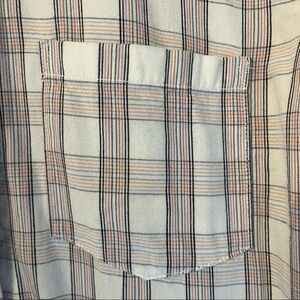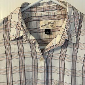Universal Thread Plaid Shirt (XS) – Lightweight, oversized button-down in a muted plum, cream, and navy plaid. Made from a soft cotton-rayon blend with a relaxed drape, curved hem, and chest pocket. Great for layering year-round.