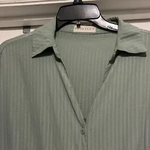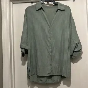 Super cute oversized button down with collar, subtle pinstripe and v neck.