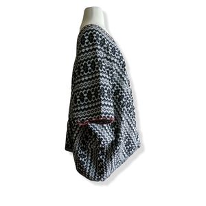 Medium weight oversized boxy black & white poncho with double sided v-neck. traditional local tribal print, made in Thailand. Purchased from a crafts market in Chiang Mai where the seamstress added red stitching around the neck by hand. Feather hem at the bottom. Fits XS, Small or Medium. Length shoulder to hem 28".
