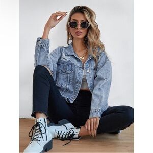 Oversized distressed ripped Front Flap Pocket Drop Shoulder Denim jean Jacket