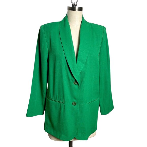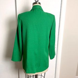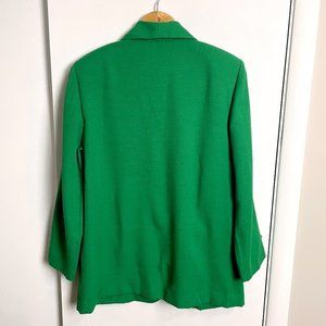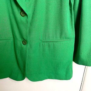 Bright emerald green slightly oversized blazer by Fundamental Things Petites. Textured weave jacket has a shawl collar and two buttons. False pockets on the front. Unlined. Lightweight enough for summer, layer it up for winter. Made in the Dominican Republic.