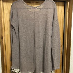 Tan/blush oversized knit top. See through, very thin. Cream & black lace trim. Has pilling on this top. Still looks great. Hangs beautifully.