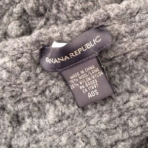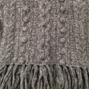 Super warm & snuggly! Heathered grey cable knit w tiny pompoms & 9" fringe. Approx 6 ft long. Wool & nylon blend.
