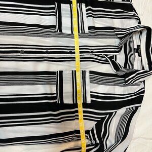 Black and white striped dress. Looks great with leggings. Covers the butt and flowy. Roll tab sleeves. I loved this piece. Both comfortable and dressy.