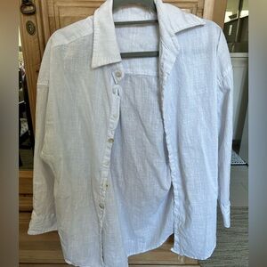Oversized white linen shirt with natural colored buttons. Great for a cover up over a bathing suit