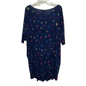 Blue hi low tunic featuring vibrant star design. Includes pink, blue, yellow, and black stars. Scoop neck with longer hem in back makes this great with leggings. P2P 30 Inches Length 33.5 Inches