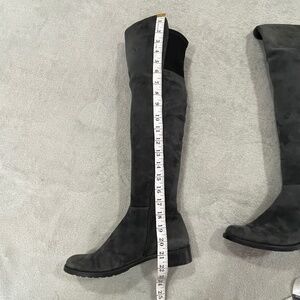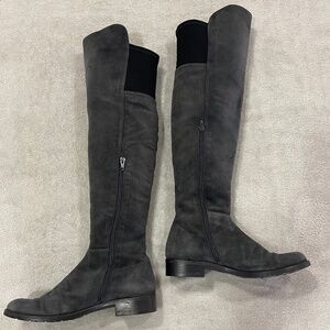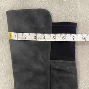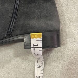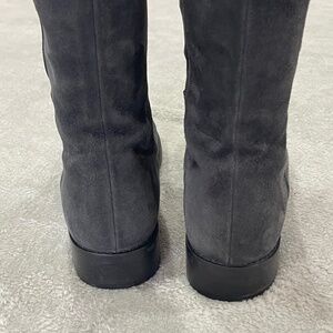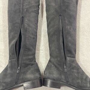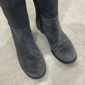 Gray suede uppers with elastic paneling on the back of the knee and an exposed side zipper. They have a round toe with a 1" heel and grooved rubber outsoles. Silky satin inner lining.