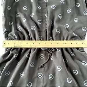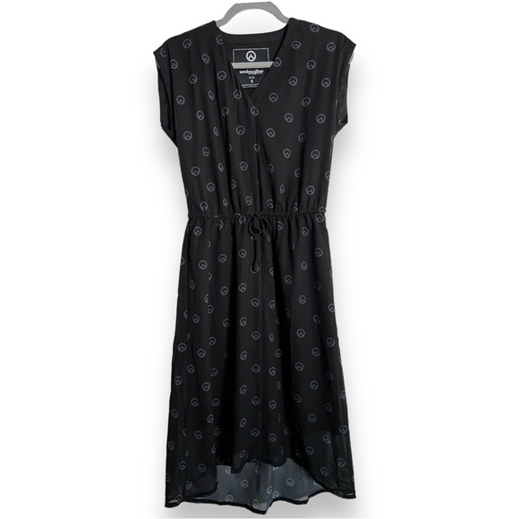 Black with gray print. Overwatch Logo Dress with drawstring at the waist, midi high low, short sleeves, and pockets on both sides.