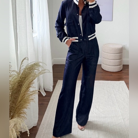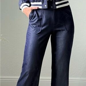 Stylish side wide leg pants by Ovi. Dark blue hue. Perfect for versatile wear. Like luxury jean not heavy more for dress and not ironed.