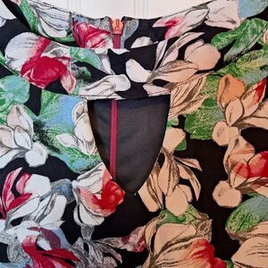 Multi color floral print, round neckline with cutout/keyhole, 3/4 Belle sleeves, back zipper closure, lined, at or slightly below knee length depending on your height