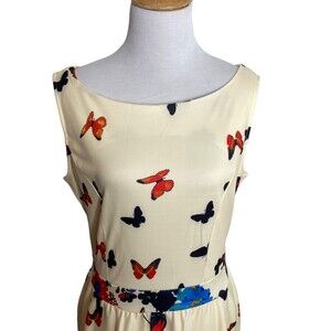 Owin Cream Butterfly Floral A Line Fit and Flare Dress. Size Medium. Brand New. NWT. Zipper in back. Tie in back.  Oraange, blue and black outline.