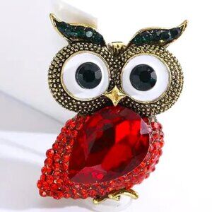Owl Brooch Rhinestone Enamel Pin Gold Gems Choose Color Red Blue Lapel Big Eyes