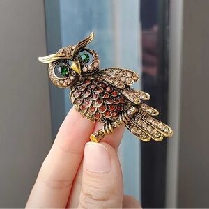 This exquisite owl brooch features stunning green and gold accents, perfect for adding a touch of elegance to any outfit. Its intricate design makes it a standout piece in any jewelry collection.