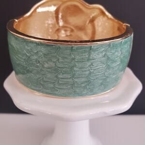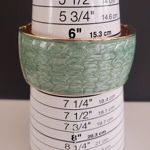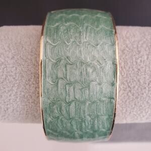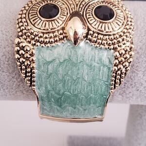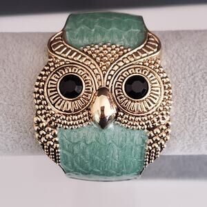 This owl bangle is iridescent green on a gold tone base. Owl is gold town with black faceted stone eyes. 2 inches wide and 7 inches around inside. Very good condition.