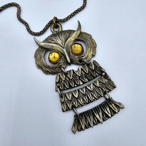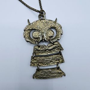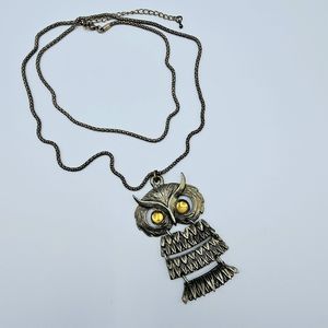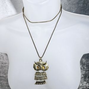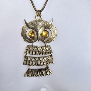 Owl Necklace Vintage Dangle Yellow Lucite Cabochon Articulated Gold Tone Bird. Unsigned Vintage. 30" Adjustable to 32". Owl pendant is 1 3/4" x 2 3/4". The pendant is vintage. I added the necklace that is not vintage. In great pre-owned condition.