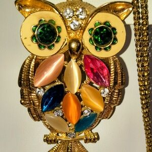 This vibrant owl pendant necklace features a stunning array of colors, including green, pink, orange, blue, and gold. Perfect for adding a playful touch to any outfit.