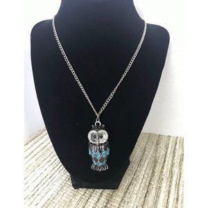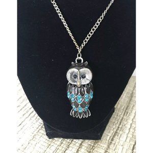 Owl Pendant Necklace Silver Tone Black Blue Rhinestone Chain Jewelry