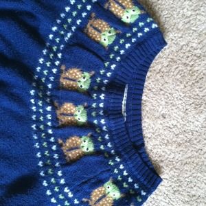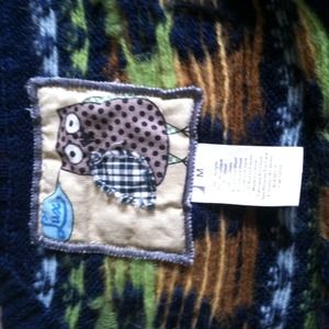 Navy blue sweater with brown and green owls across collar. It has a slight boat neck. Super cute design! Size M