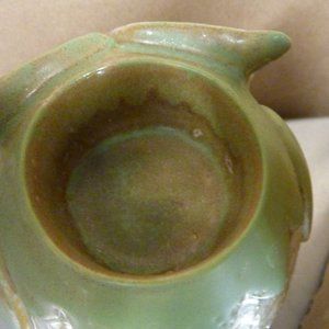 The green color is a matte finish while the ivory mottled textured body is glazed. 4 rubber pads are on the bottom to avoid scuffing. So very cute and unique.