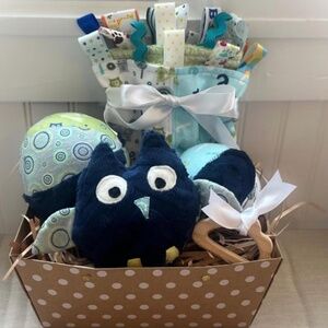 This set includes the owl plush that jingles, to the delight of babies and toddlers and a coordinating jingle ball that is sewn of a variety of fabrics to engage your baby with a soft and fluffy tactile experience and a coordinating sensory blanket that your infant will love for years to come. I have also added a wooden teether that will fit perfectly in your little ones hands.