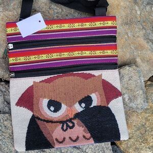 Owl Canvas Crossbody Bag with 2 zipper compartments and adjustable strap.