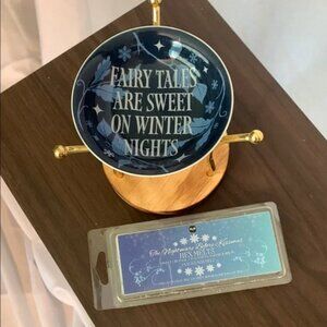 Wax warmer from OwlCrate’s winter holiday box 2024. Wax warmer is two pieces with a tea light holder and a small plate to hold wax that sits on top and reads “Fairy tales are sweet on winter nights”. Included a wax melt called the nightmare before Kissmas sweet orange, cinnamon and bourbon wax melts also from OwlCrate!