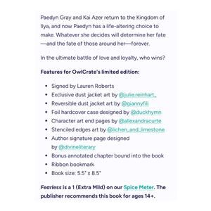 ❥ Description - Owlcrate Special Signed Edition Fearless By Lauren Roberts! Such a beautiful edition, pre-ordered this and decided to keep a different edition instead!