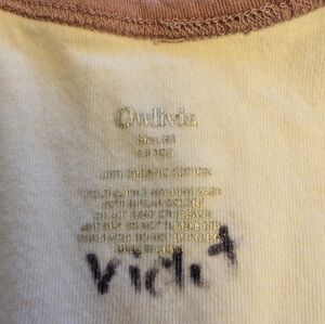 Cozy and adorable sleeveless pajamas for kids. Features a charming pink color with playful patterns. Perfect for a comfortable night's sleep. Does have a name written under the size.