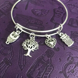 Owls Tree Heart High Polish Stainless Steel Adjustable Charm Bracelet NWT