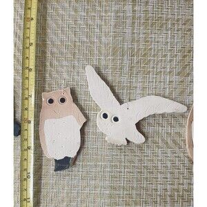 Handmade driftwood wind chimes featuring painted ceramic owl figurines attached with fishline. Each owl is painted on both sides. Mounted on a natural driftwood log, giving it a rustic, cabin-style look. Unique piece of hanging decor for indoor or outdoor display.