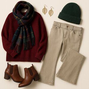 Wear with a flowy patterned top, a longline cardigan in plum, stacked bracelets, and wedge booties.