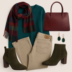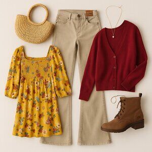 Pair with a deep emerald green blouse, sapphire blue cardigan, burgundy scarf, black ankle boots, and gold jewelry.