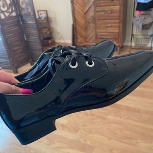 Sleek black Oxford dress shoes. Never worn. I got them as a gift and can’t return. I have wide feet and these are a little too narrow for comfort for me.